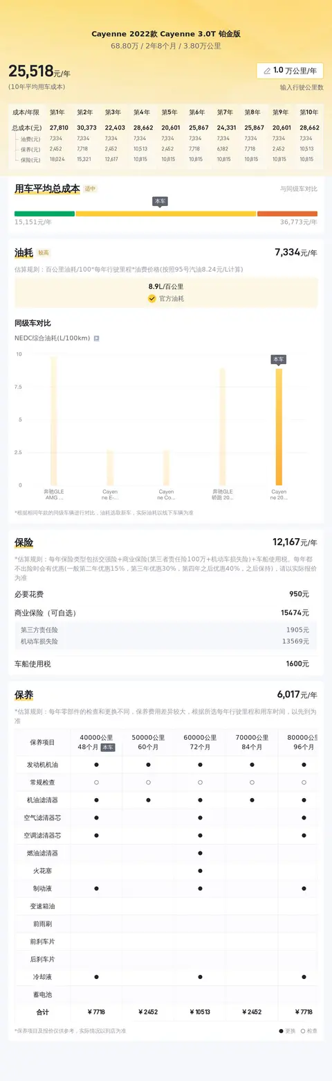 用车成本方面,按一年行驶一万公里计算,包括保险费、油费等,平均每年的用车成本约为2.6万元。