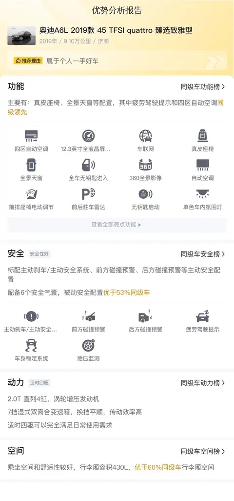 总结:总的来说,这辆二手奥迪A6L 2019款 45 TFSI quattro 臻选致雅型在动力性能、配置丰富程度以及安全性能等方面都表现出色,是一款值得考虑的二手车选择。当然,在购买二手车时,还需要根据车辆的具体情况进行综合评估,确保购买到一款性价比高、品质可靠的二手车。