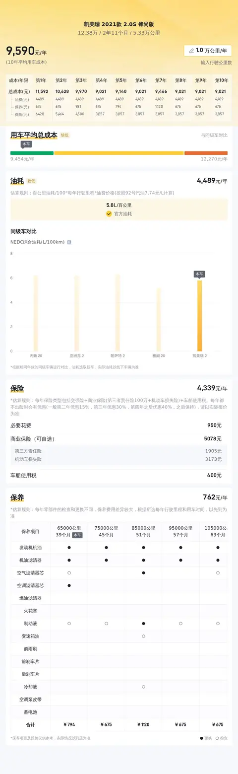 目前这款凯美瑞 2021款 2.0S 锋尚版的二手车市场价格在12.35万至14.73万之间,具体售价会根据车况的不同而有所差异。在用车成本方面,根据估算,这辆车年均综合用车成本大概在每年1.0万元左右。当然,具体的用车成本还需要根据车主的用车习惯和环境等因素来确定。