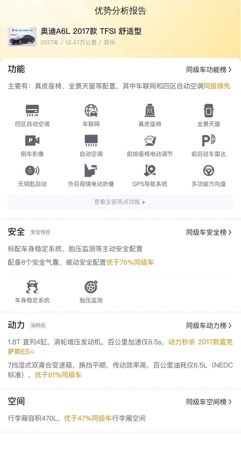 这辆二手奥迪A6L的具体版本是——2017款 TFSI 舒适型。该车目前报价15.99万元,相比新车指导价45.65万元,价格优惠了29.66万元。该车上牌地和车源地均为郑州,上牌日期2017年6月,表显里程12.47万公里,车身颜色为黑色,有1次过户记录。