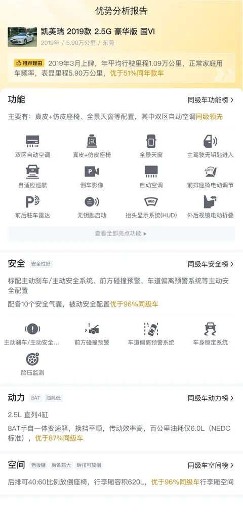 凯美瑞 2019款 2.5G 豪华版 国VI是一款性价比极高的中型轿车,无论是从动力、配置还是空间方面都表现出色。如果您正在寻找一款品质可靠、性能稳定的二手车,那么凯美瑞 2019款 2.5G 豪华版 国VI绝对是一个不错的选择。