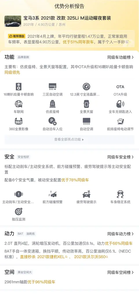本篇介绍的宝马3系为2021款 改款 325Li M运动曜夜套装版本,定位中型车,外观为黑色,内饰为深色配色。新车含税价为40.42万,如今二手车报价21.80万,2021年04月首次上牌,在此期间过户0次。车源地和上牌地均为苏州。截至2024年,行驶里程为4.90万公里,该车符合国VI排放标准。