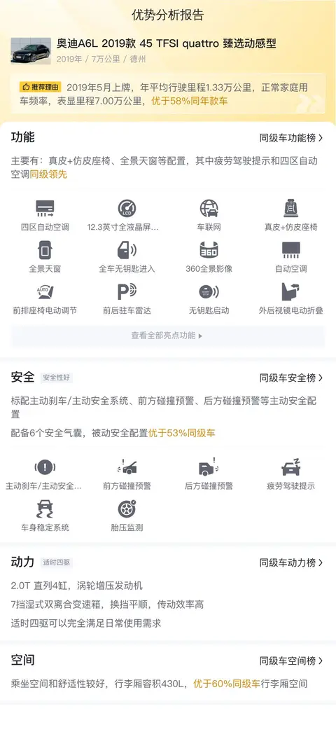 这辆二手奥迪A6L的具体版本为——2019款 45 TFSI quattro 臻选动感型,定位中大型车,上牌地为山东德州,上牌日期2019年5月,表显里程7万公里,新车指导价46.38万,二手车报价24.98万,过户次数2次。
