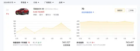 结合销量数据来看,今年7月,长安马自达CX-30销量只有两位数,销量在该级别市场排名第31名。更多消息,懂车帝将持续关注。