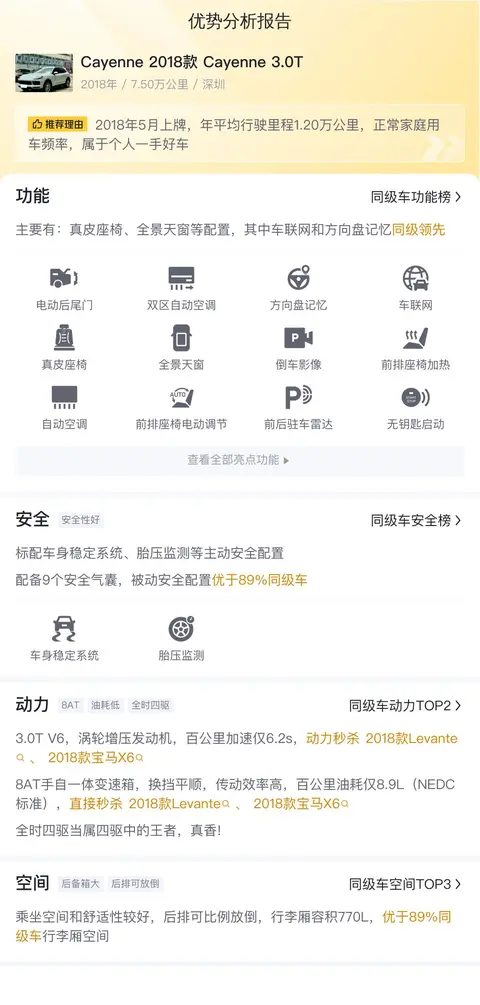 总结:总的来说,这款二手保时捷Cayenne 3.0T虽然在油耗和维修保养方面存在一些缺点,但其动力强劲、操控性能好、外观时尚、内饰豪华、配置丰富等优点仍然值得考虑。如果您对这些方面有较高的要求,并且能够接受其缺点,那么这款车将是一个不错的选择。当然,具体选择还需根据个人实际情况来定。文中用车成本、市场行情、优势分析、同款比价等数据仅供参考,车况信息需要线下结合车辆实际情况进行综合参考。