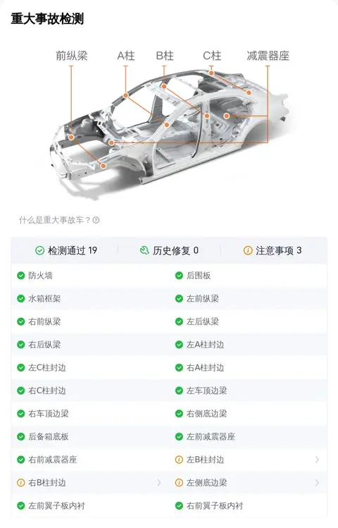在车况部分,除了外观、内饰功能的检测,更多买家关注的是这辆车是否为“三非”车辆,三非就是指非重大事故、非火烧、非水泡。因为事故车、泡水车、火烧车都存在较大的安全隐患。不过您放心,这辆车已经通过了事故检测、火烧检测和泡水检测,可以确定它非重大事故车、非火烧车、非泡水车。