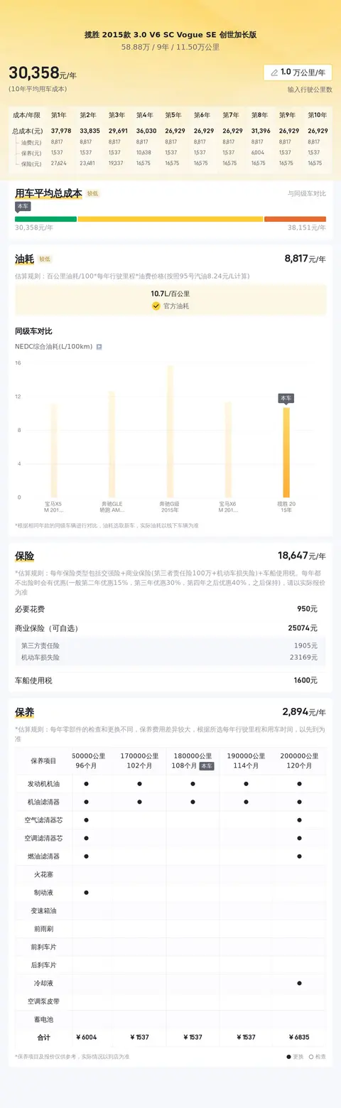 用车成本方面,按照一年行驶一万公里计算,这辆揽胜 2015款 3.0 V6 SC Vogue SE 创世加长版的用车成本大概在每年3万元左右,具体费用包括燃油费用、保险费用、保养费用等。当然,这个费用也会根据您的用车习惯和用车环境而有所不同。