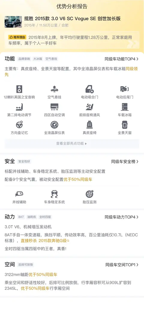 总的来说,这辆揽胜 2015款 3.0 V6 SC Vogue SE 创世加长版虽然已经行驶了9年,但整体车况还是不错的,动力强劲,配置丰富,是一款性价比很高的二手车。如果您正在寻找一款豪华越野车,那么这辆揽胜 2015款 3.0 V6 SC Vogue SE 创世加长版绝对值得您考虑。