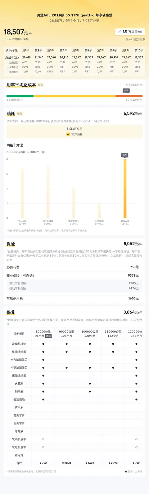 市场行情方面,根据懂车帝的数据,这款车型的二手车价格在25.31万至30.49万之间。具体售价因车辆状况而有所不同。而在用车成本方面,这辆奥迪A6L 2019款 55 TFSI quattro 尊享动感型的10年平均成本约为19107元/年(按每年行驶2万公里计算),包括油费、保养费和保险费,相较于同级别车型处于较高水平。在车况部分,除了外观、内饰功能的检测,更多买家关注的是这辆车是否为“三非”车辆,三非就是指非重大事故、非火烧、非水泡。因为事故车、泡水车、火烧车都存在较大的安全隐患。不过您放心,这辆车已经通过了事故检测、火烧检测和泡水检测,可以确定它非重大事故车、非火烧车、非泡水车。