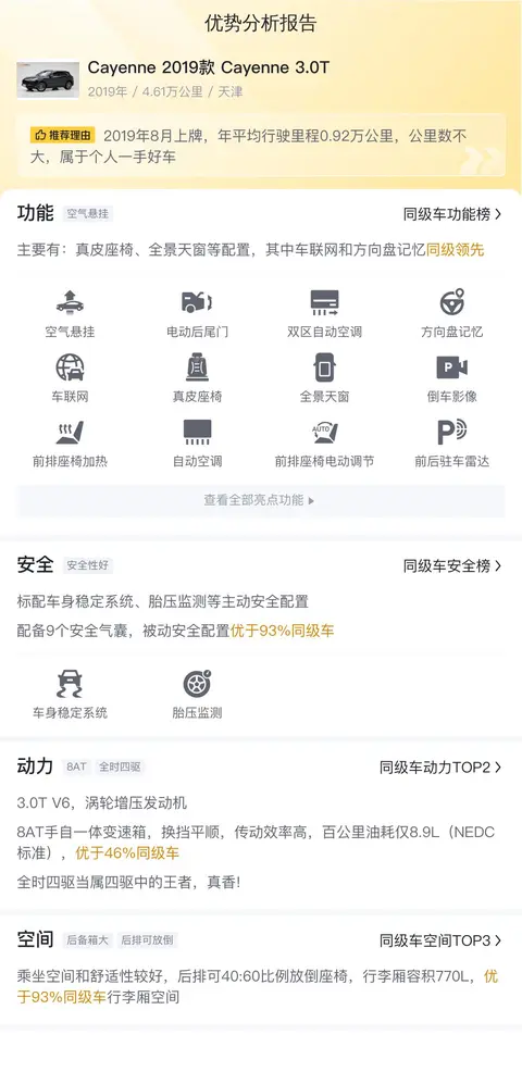 档案信息方面,这台Cayenne是一台未曾过户的准新蓝色2019款Cayenne入门车型,搭载3.0T发动机并配备8速手自一体变速箱以及全时四驱系统,符合国六排放标准。截至2024年6月,该车行驶里程为4.6万公里,车源及车牌所在地均在天津。