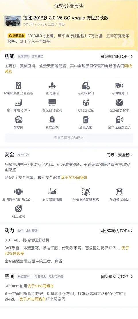 综上所述的新车含税价、用车成本、市场行情、优势分析、同款比价等数据仅供参考。在配置部分,因为二手车非标品,车辆可能会存在配置改装的情况,具体车况信息需要线下结合车辆实际情况进行综合参考。