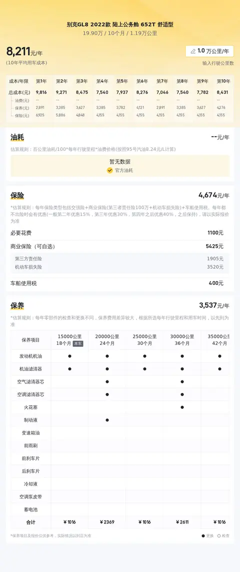 经过懂车帝综合分析,别克GL8 2022款 陆上公务舱 652T 舒适型的10年平均用车成本大约在每年1.2万元左右,与同级别车型相比处于适中区间,这款车每年油费约6767元,保养费每年约2784元,保险费用参考值为5101元/年,实际费用根据保险公司及使用情况而定。