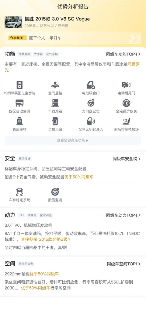 综上所述的新车含税价、用车成本、市场行情、优势分析、同款比价等数据仅供参考。在配置部分,因为二手车非标品,车辆可能会存在配置改装的情况,具体车况信息需要线下结合车辆实际情况进行综合参考。