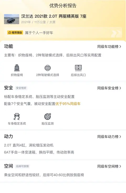 综合来看,这辆汉兰达 2021款 2.0T 两驱精英版 7座虽然已经有3年多的车龄,但无论是从外观还是内部配置来看,都依旧有着不错的品质。它拥有宽敞的空间,可以轻松容纳7口之家,动力性能也充沛,再加上其合理的售价,使其在众多二手车中显得格外出众。如果你正在寻找一款既能满足家庭出行需求,又能带来良好驾乘体验的二手车,那么这辆汉兰达 2021款 2.0T 两驱精英版 7座绝对是一个不错的选择。