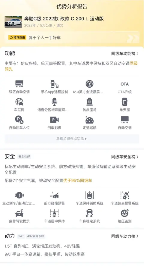 据估算,同级车的最低用车成本是6506元/年,最高是14020元/年,奔驰C级 2022款 改款 C 200 L 运动版是13278元/年,所以用车成本较高。