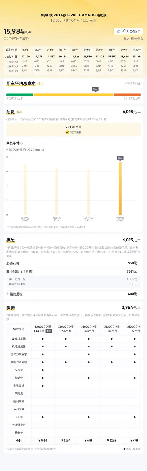 据估算,同级车的最低用车成本是11178元/年,最高是18340元/年,奔驰C级 2016款 C 200 L 4MATIC 运动版是15755元/年,用车成本不算低。