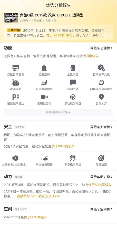 这款奔驰C级2015款改款 C 200 L 运动型的缺点也都存在,但是看个人选择,如果觉得可以入手,那整体车况还是不错的,毕竟开九年多也就跑了7万公里,一年一万公里不到,车子用得不多。价格也合适,现在只要12.8万就能拿下。