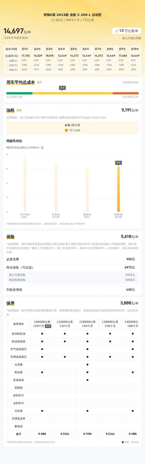 据估算,同级车的最低用车成本是12777元/年,最高是18120元/年,奔驰C级 2015款 改款 C 200 L 运动型是15135元/年,用车成本适中。