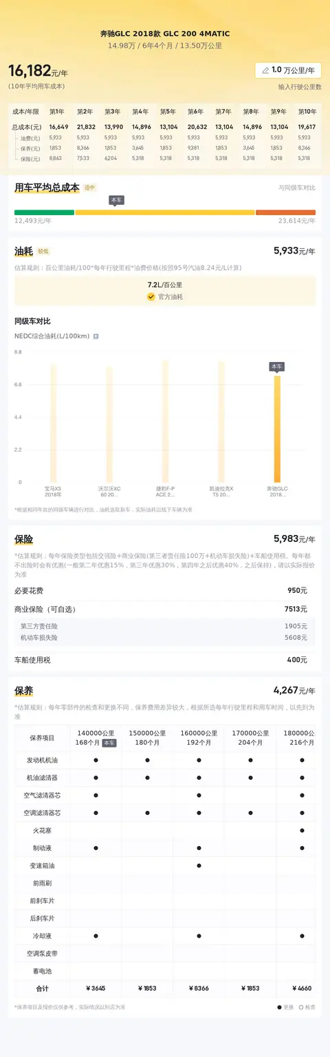 据估算,同级车的最低用车成本是13178元/年,最高是18720元/年,奔驰GLC 2018款 GLC 200 4MATIC是15680元/年,整体不算低,但也不算高。