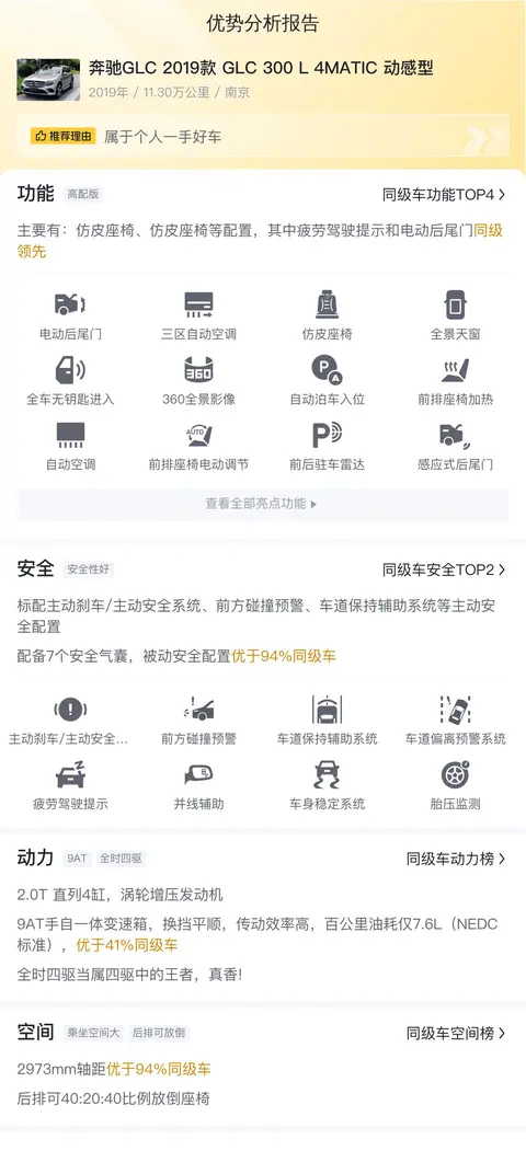 据估算,同级车的最低用车成本是6506元/年,最高是18790元/年,奔驰GLC 2019款 GLC 300 L 4MATIC 动感型是15778元/年,不算低,但也算正常水准。