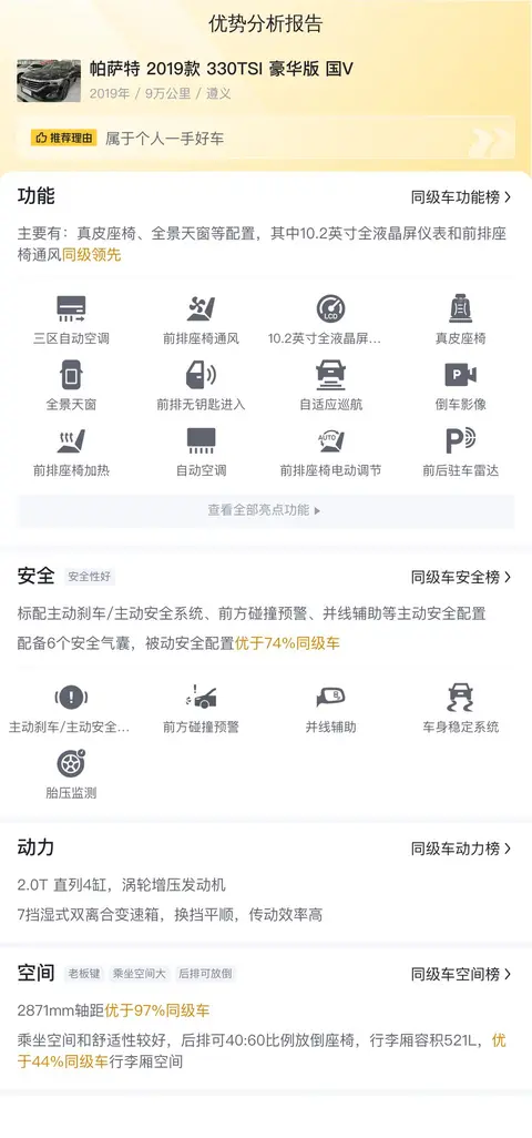 大众帕萨特(图片|配置|询价)在中国有着特殊的地位,网络上有句戏言,开这款车穿上行政上衣,去走亲戚,谁见了都高看一眼。曾经的政府用车,着重的就是一个性能好,皮实耐用。凭借着品质和可靠性,大众帕萨特在众多消费者心中有着不一样的地位。下面这辆帕萨特 2019款 330TSI 豪华版 国V,是2019年上牌的车子,跑了9万公里,为国V排放标准,报价10.68万,属于比较低的价格了。