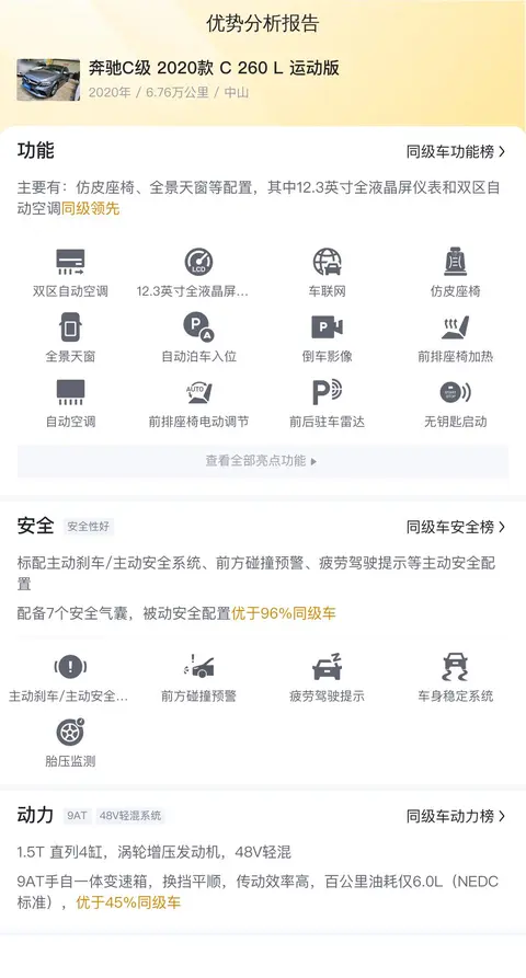 我们来看看这辆二手奔驰C级 2020款 C 260 L 运动版的配置。它搭载了一台1.5T涡轮增压发动机,配合48V轻混系统,最大输出功率为135kW(184马力),峰值扭矩为280Nm。传动系统匹配的是9速手自一体变速箱,这台变速箱在提供平顺的驾驶体验的同时,也保证了良好的燃油经济性。官方公布的百公里加速时间为8.5秒,NEDC综合油耗为6L/100km。