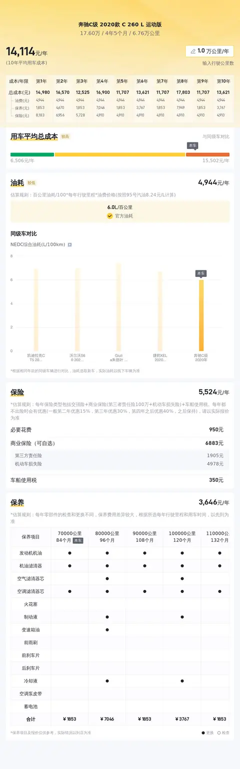 当前汽车市场,奔驰C级 2020款 C 260 L 运动版的二手车行情较为平稳。根据不同车况和里程数,其售价在15.65万至18.99万之间。最终的售价会受到车辆状况、维护记录以及市场需求等多种因素的影响。关于用车成本方面,我们将通过图片向您展示该车型在保养、保险以及燃油消耗等方面的平均花费。这些数据将帮助您更全面地了解拥有这样一辆奔驰C级的真实成本。