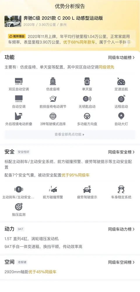 据估算,同级车的用车成本最低是6103元/年,最高是14002元/年,奔驰C级 2021款 C 200 L 动感型运动版是13678元/年,所以用车成本较高。