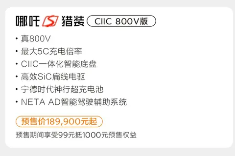 值得一提的是,哪吒S猎装还推出了CIIC 800V版,它全球首搭宁德时代一体化智能底盘,发布会上公布的预售价是18.99万元起。