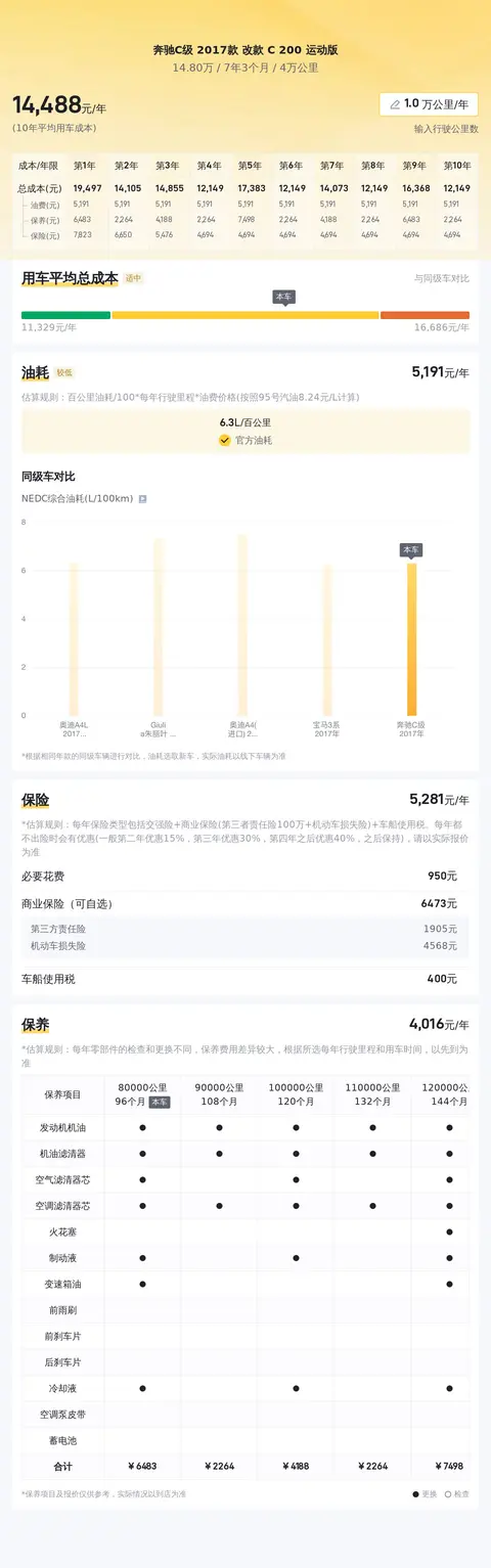 据估算,奔驰C级 2017款 改款 C 200 运动版的用车成本也较高,因为它的用车成本是14238元/年,同级车最低用车成本是11508元/年,最高用车成本是15450元/年。