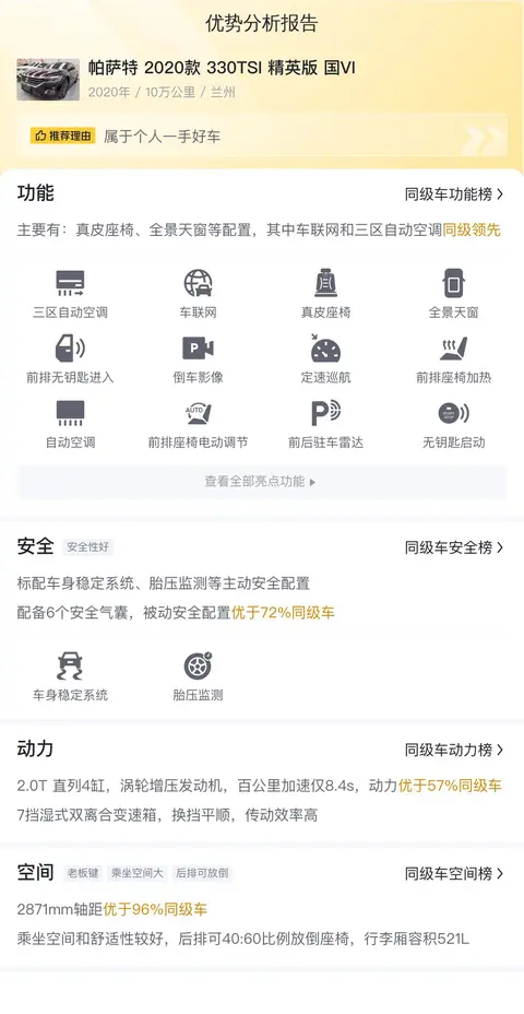 优势:德系车的底盘质感就是丰富的,高速稳,过滤震动好。帕萨特的百公里加速成绩是8.4秒,动力储备足够,可以一直用一直有。车型在全国的保有量大,保值率高,品质经过市场验证,让人放心。