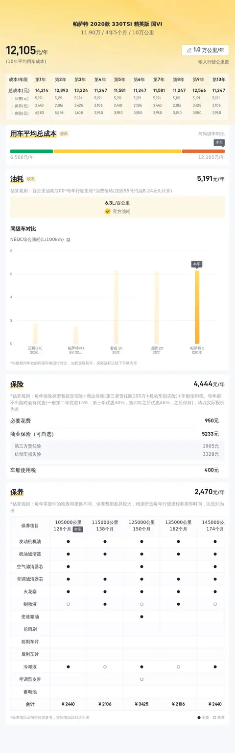 据估算,同级车的最低用车成本是6506元/年,最高是12178元/年,帕萨特 2020款 330TSI 精英版 国VI是12178元/年,所以用车成本较高。