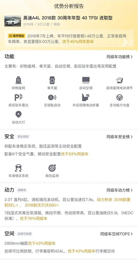 综上所述,这辆奥迪A4L 2018款 30周年年型 40 TFSI 进取型在配置和性能方面都有着不错的表现。它搭载的2.0T发动机和7挡双离合变速箱提供了充沛的动力和平顺的驾驶体验。车身尺寸和内部空间也足够宽敞,能够满足家庭使用的需要。如果你正在寻找一辆性能出色、配置丰富的二手车,那么这辆奥迪A4L无疑是一个值得考虑的选择。