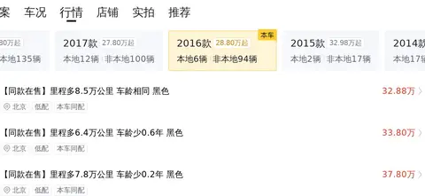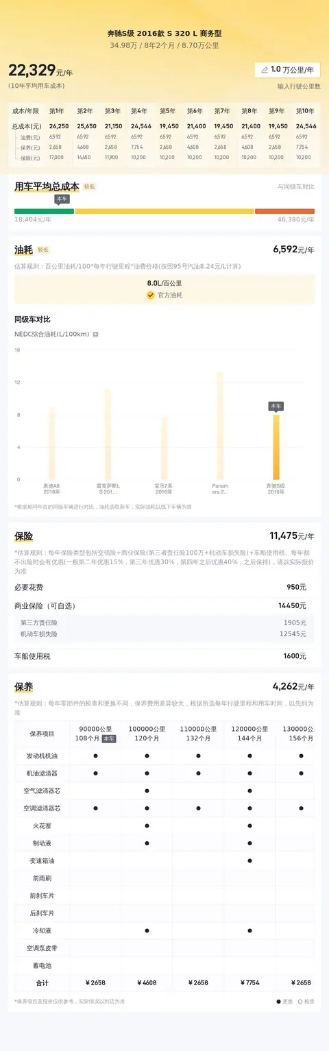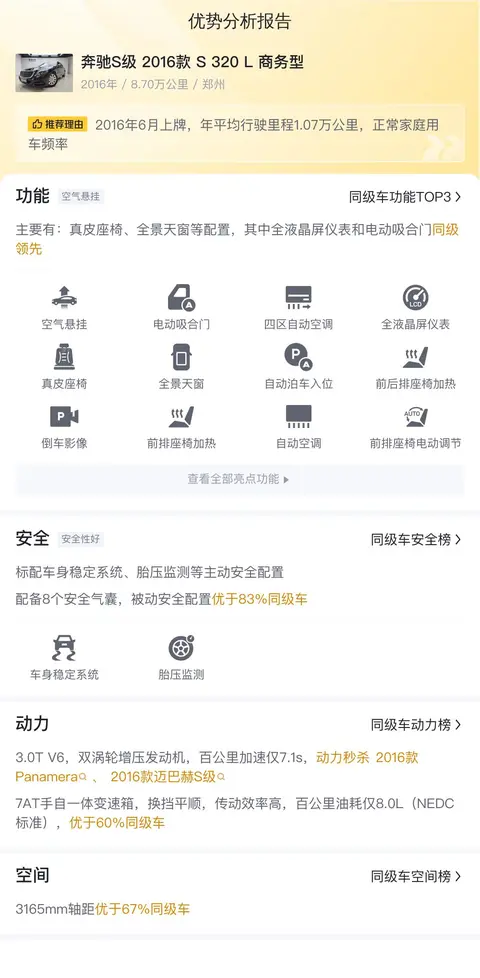奔驰S级 2016款 S 320 L 商务型,新车含税价为102.36万,现在的二手车报价是34.98万,2016年6月首次上牌,在此期间过户1次。
