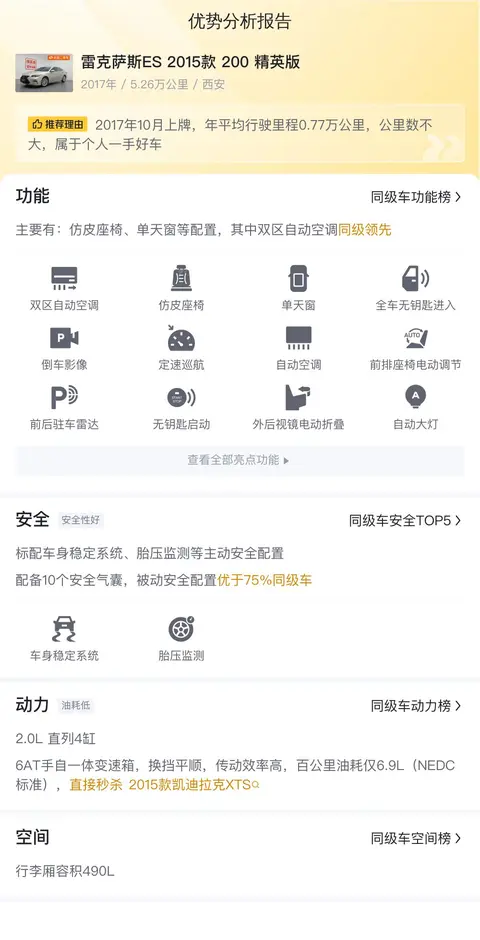 优势:雷克萨斯ES 2015款 200 精英版的市场行情价是11.74万-14.12万,它的报价则是13.28万,价格适中合理,而且这款车属于热门车型,保值率高,另外,车子的里程数较少,使用时间短,安全配置丰富,空间也比较宽敞。