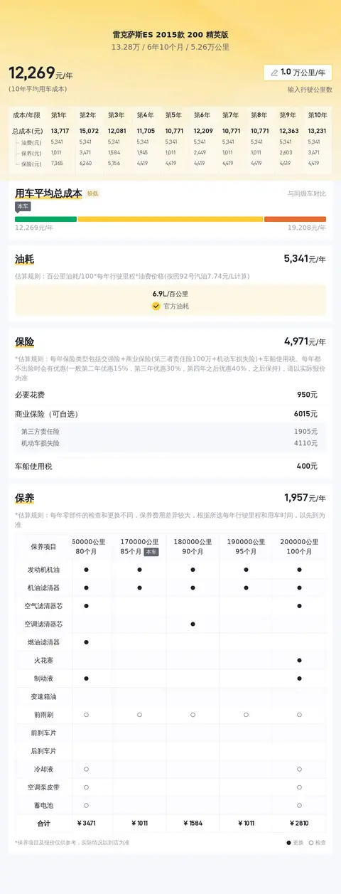 据估算,同级车的最低用车成本是11725元/年,最高是19466元/年,雷克萨斯ES 2015款 200 精英版是12135元/年,所以比较低。