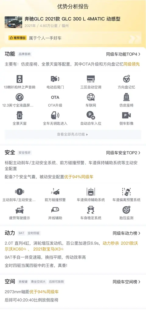 优点是作为豪华SUV的开创者之一,奔驰GLC有着天然的品牌优势,且市场保有量极高,保值率也很高。这辆奔驰GLC 2021款 GLC 300 L 4MATIC 动感型使用不多,性能状态良好,且报价低于市场行情,性价比较高。