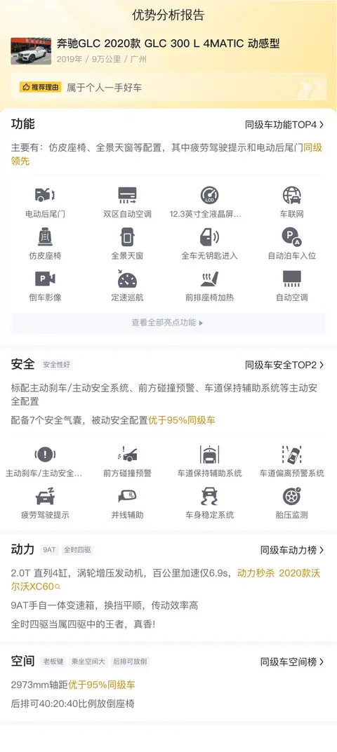 优势:作为豪华型SUV,可以说是比较受市场欢迎的了。加上奔驰GLC的名气大,市场欢迎度高,保值率也很高。这款车的动力强劲,配置丰富。声名在外,品质也无需过多担心。
