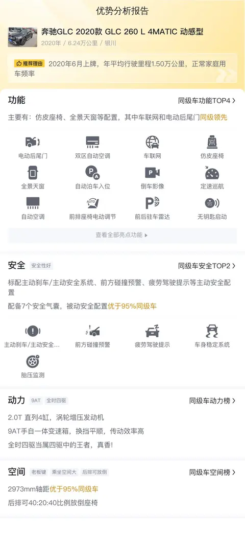 明显优点,豪华品牌车型,具有较高的社会认同度;配置丰富,使用感受好;动力强劲,驾驶感好;SUV车型,空间大,适合全家出行。潜在缺点,奔驰GLC 2020款 GLC 260 L 4MATIC 动感型保值率高,价格一直下不来,属于购车成本略高车型;该款二手车型里程数不高,车况较好,不过仍需要仔细辨别,防止踩坑。