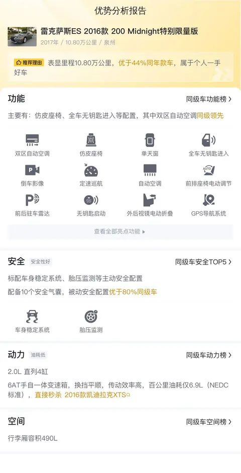 优点是血统纯正,属于原版原漆,另外雷克萨斯ES一直以来都是舒适性的代表,再加上它的后排空间很大,乘坐体验舒适,用来做商务接待也很合适。