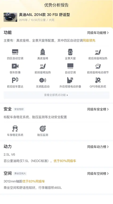 与同级别车型相比,奥迪A6L 2014款 30 FSI 舒适型在配置、性能、舒适性等方面均表现出色。其合理的价格区间使得它成为了众多消费者心中的理想之选。如果你正在寻找一款既有档次又具性价比的豪华轿车,那么奥迪A6L 2014款 30 FSI 舒适型二手车无疑是值得考虑的选择。