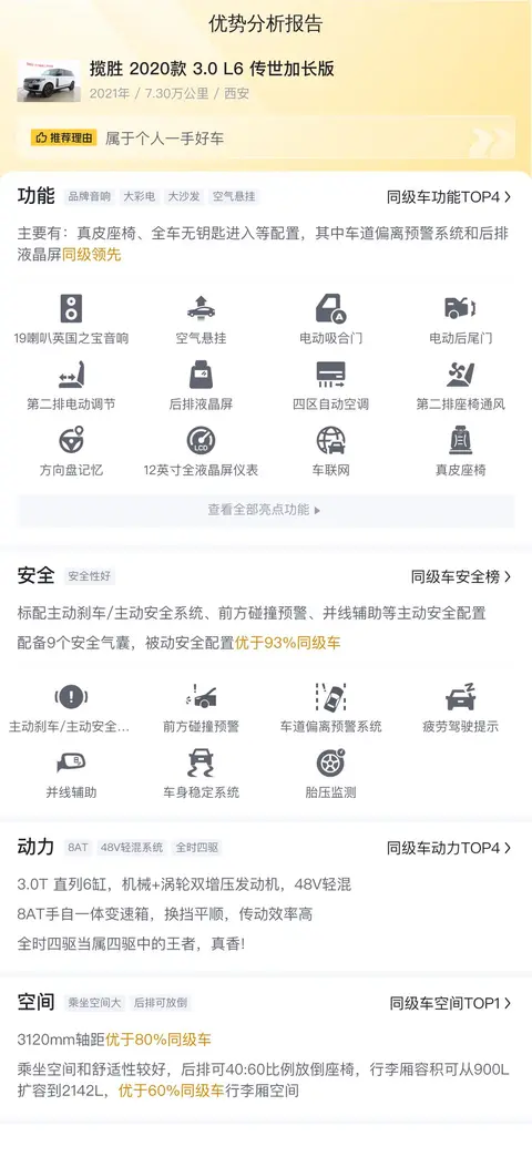 综上所述的新车含税价、用车成本、市场行情、优势分析、同款比价等数据仅供参考。在配置部分,因为二手车非标品,车辆可能会存在配置改装的情况,具体车况信息需要线下结合车辆实际情况进行综合参考。