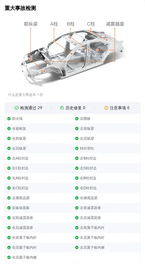 二手车不同于新车,在日常使用中难免会发生一些小意外。比较常见的就是车辆外观覆盖件划伤、剐蹭、划痕、喷漆修复、钣金修复、凹陷、变形等,对于此类小瑕疵,虽然在检测项中会被查出来判定为瑕疵项,但整体并不影响车辆的安全性。总结说一下,如果车辆通过了重大事故、泡水、火烧检测检测,那么说明这辆车的整体车况没有大问题,这个您放心就行。