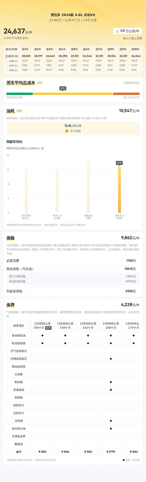 在用车成本方面,这辆普拉多 2010款 4.0L 自动VX的10年平均用车成本是25465元/年,同级车的最低10年平均用车成本是19944元/年,最高是31851元/年,所以该车的用车成本适中。