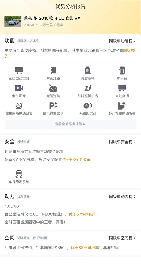 优势方面,这辆普拉多 2010款 4.0L 自动VX的前后排空间宽敞,适合家庭使用;车载冰箱和第二排电动调节座椅提供了更高的舒适性和便利性;强大的动力输出和良好的越野性能,适合各种路况行驶。