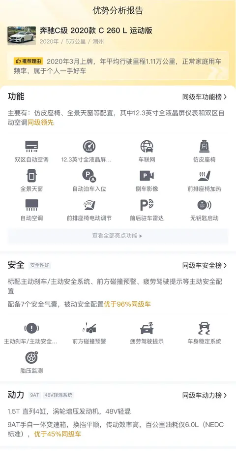 通过懂车帝的大数据分析,我们总结了奔驰C级2020款C260L运动版相比同级别车型的一些核心优势,主要集中在动力、空间、操控性等方面。认识这些优势,有助于您更加清晰地把握这款车的竞争力所在,从而做出更加明智的购车决策。