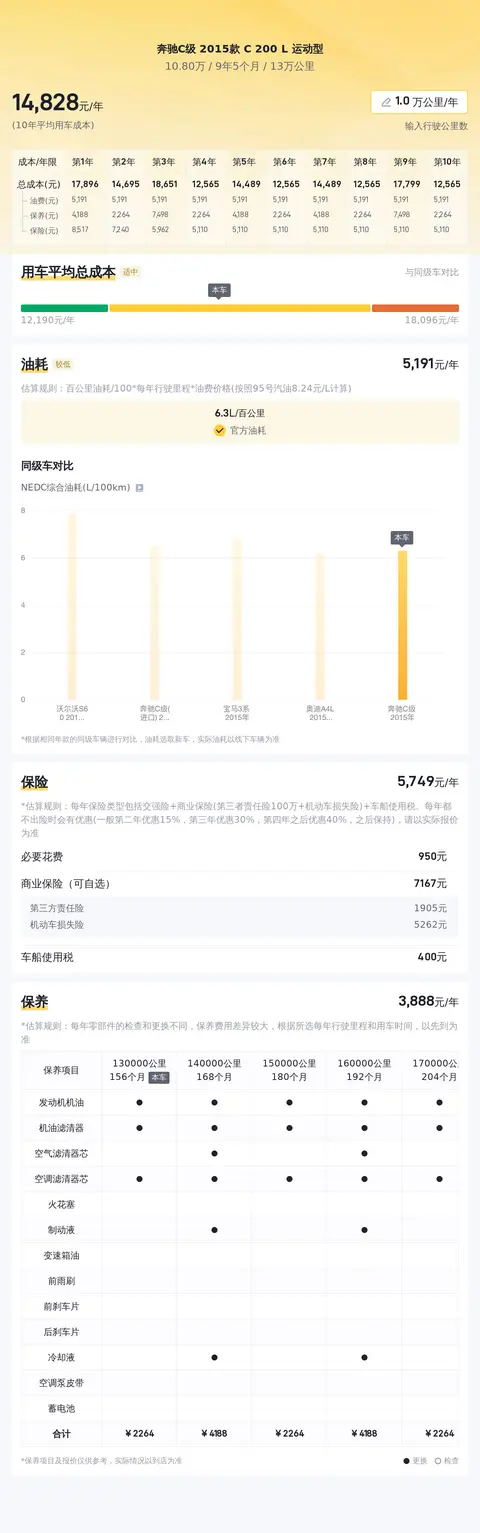 据估算,同级车的最低用车成本是12468元/年,最高是18372元/年,奔驰C级 2015款 C 200 L 运动型是15133元/年,用车成本不算低,但也不算高。