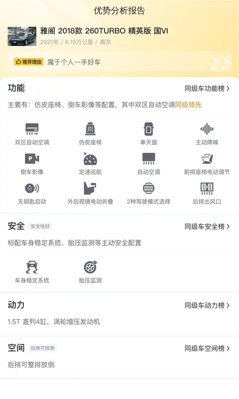 综上所述的新车含税价、用车成本、市场行情、优势分析、同款比价等数据仅供参考。在配置部分,因为二手车非标品,车辆可能会存在配置改装的情况,具体车况信息需要线下结合车辆实际情况进行综合参考。