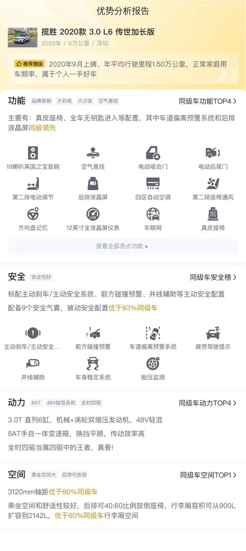 综上所述的新车含税价、用车成本、市场行情、优势分析、同款比价等数据仅供参考。在配置部分,因为二手车非标品,车辆可能会存在配置改装的情况,具体车况信息需要线下结合车辆实际情况进行综合参考。
