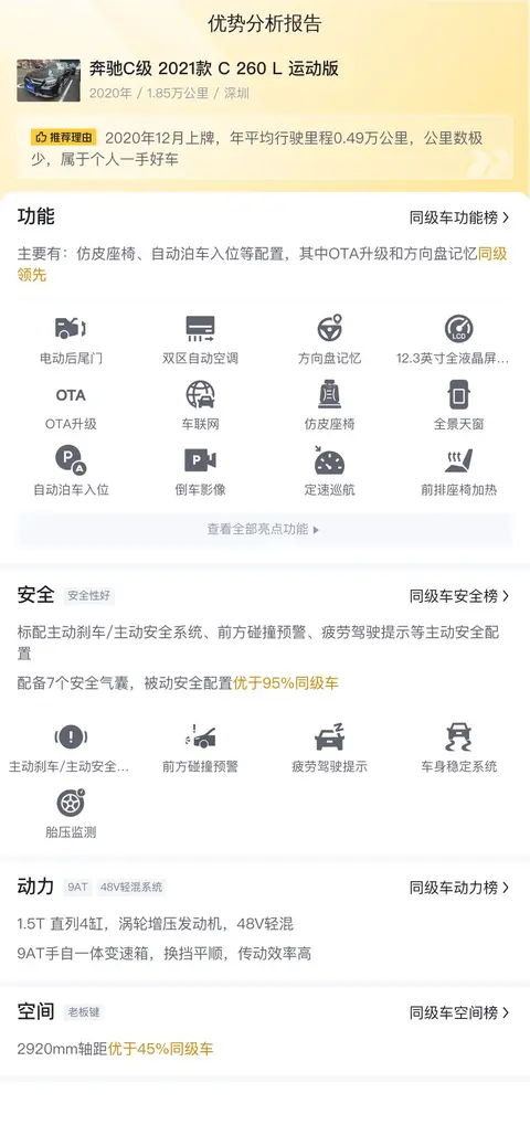 今天给大家带来的二手车是一款奔驰C级(图片|配置|询价)2021款C260L运动版,它作为一款豪华中型轿车,不仅在设计上凸显了时尚与运动感,更在性能与舒适度上满足了现代消费者的需求。这款车在动力系统、驾乘舒适性以及科技配置方面都有着出色的表现。无论是日常通勤还是周末出游,都能为您提供卓越的驾驶体验与乘坐享受。接下来,让我们来详细了解一下这款二手奔驰C级C260L运动版的具体情况吧。